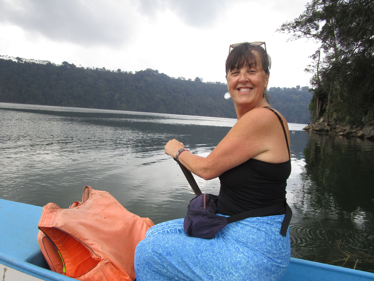 Sherrie crossing the lake in a canoe